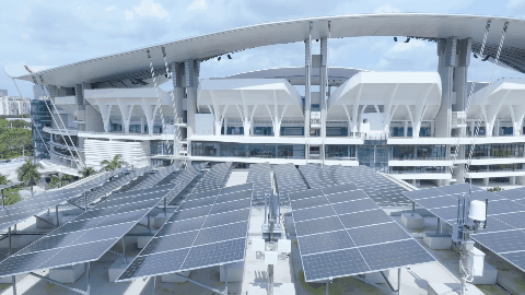 广东奥林匹克体育中心屋顶之上成排的光伏板在阳光下熠熠生辉