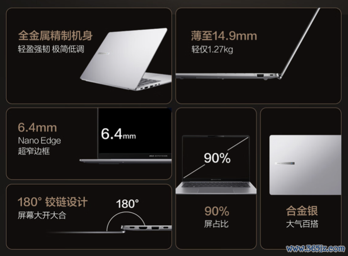 这款札记本招揽金属机身,救济180度开合,厚度14.9mm,分量1.27千克,边框6.4mm,可选“合金银”配色,提供63Whr容量电板。