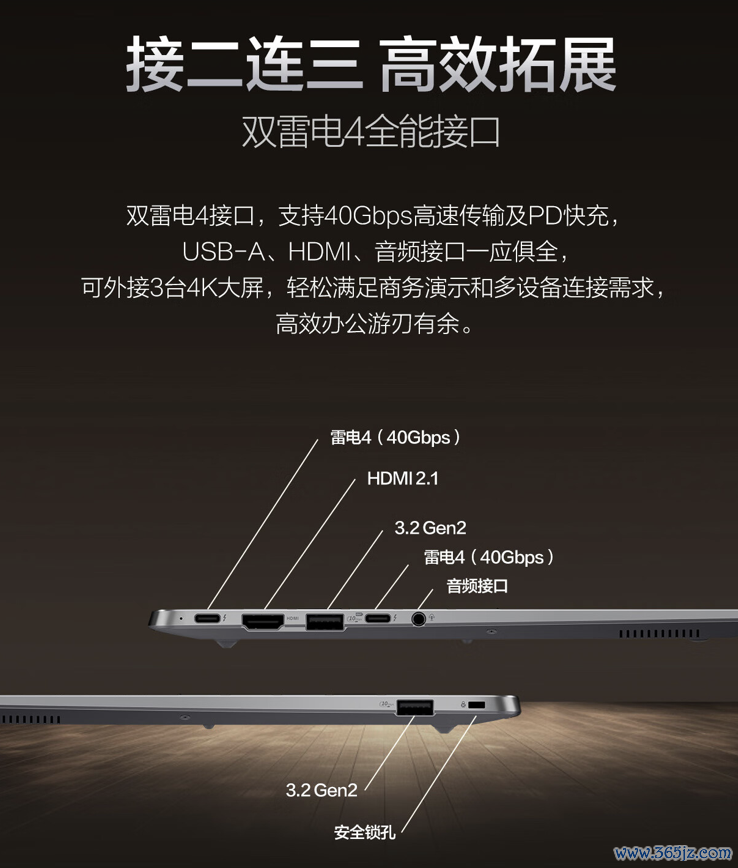 此外,IT之家获悉该机救济Wi-Fi 6E时刻,左侧提供2个雷电4接口、1个HDMI 2.1接口、1个USB-A 3.2 Gen 2接口、1 个 3.5mm音频接口;右侧配备1个USB-A 3.2 Gen 2接口。