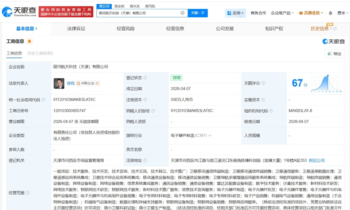 每经AI快讯,天眼查App显现,近日,星河航天科技(天津)有限公司开垦kaiyun体育,法定代表东说念主为徐鸣,注册成本500万元东说念主民币,盘算范围包括卫星出动通讯终局制造、卫星出动通讯终局销售、卫星通讯处事等,由星河航天(北京)科技集团股份有限公司全资握股。