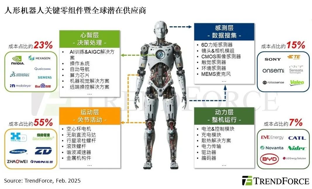 中国2021年建议“十四五”筹商,将机器东说念主产业为发展要点,不时发布东说念主形机器东说念主翻新发展携带成见等政策文献,聚焦供应链与关节零组件自主开采智力。于今中国阛阓在整机端已有宇树、傅利叶和优必选等厂商,占机器东说念主合座成本约55%的“瓦解层”,亦有开阔厂商布局空腹杯电机、6D力矩感测器、谐波降速器等。