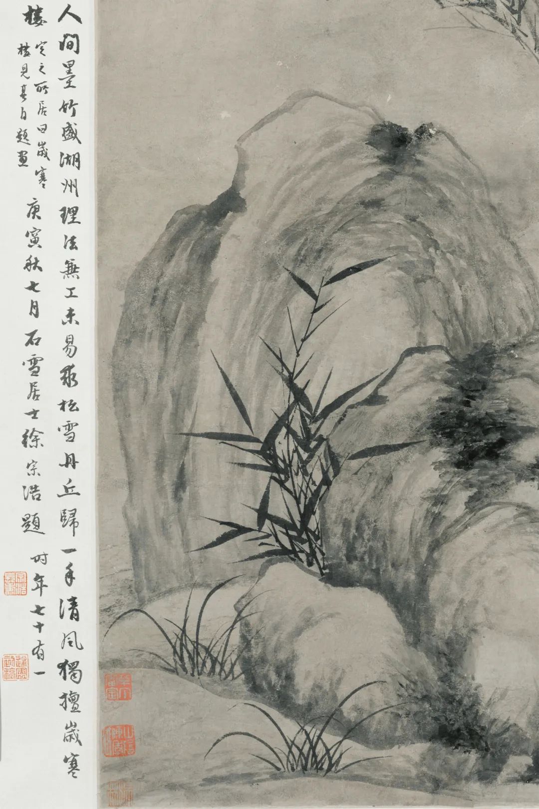 顾安画的竹石,风是主角。他画竹叶的动势,笔尖一顿一扭,无形的风就造成了有形的旋律。北京故宫那幅画,竹子往左斜,竹叶往右飞,无意在跟看不见的风较劲。这种“对着干”的劲儿,让画面张力虚耗,就像摇滚乐里的嘶吼和挣扎。他还在石头旁画几株被吹倒的杂草,仿佛在说:“再硬的石头,也挡不住风的倔性情!”