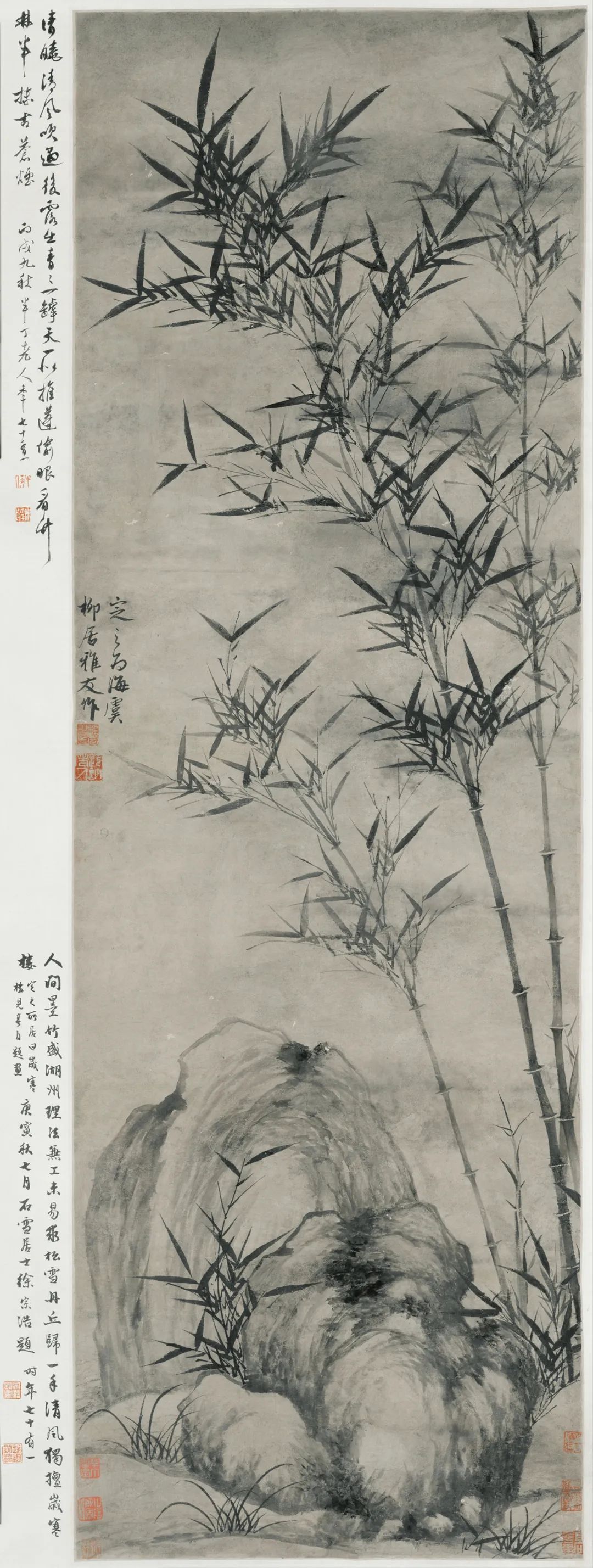 顾安笔下的石头,那是竹子的“硬核搭子”。他画石,中锋勾综合,侧锋皴肌理,石头名义跟被岁月啃过的老唱片似的,全是裂纹和坑洼。北京故宫那幅画里,石头卧在竹丛边,苔痕斑斑,有棱有角,却和纤细的竹子牢牢挨着,硬与柔的碰撞,就像摇滚乐里电吉他和小提琴混搭,绝了!更绝的是,他还在石缝里塞几株新笋,仿佛在喊:“再硬的石头,也拦不住人命的疯长!”