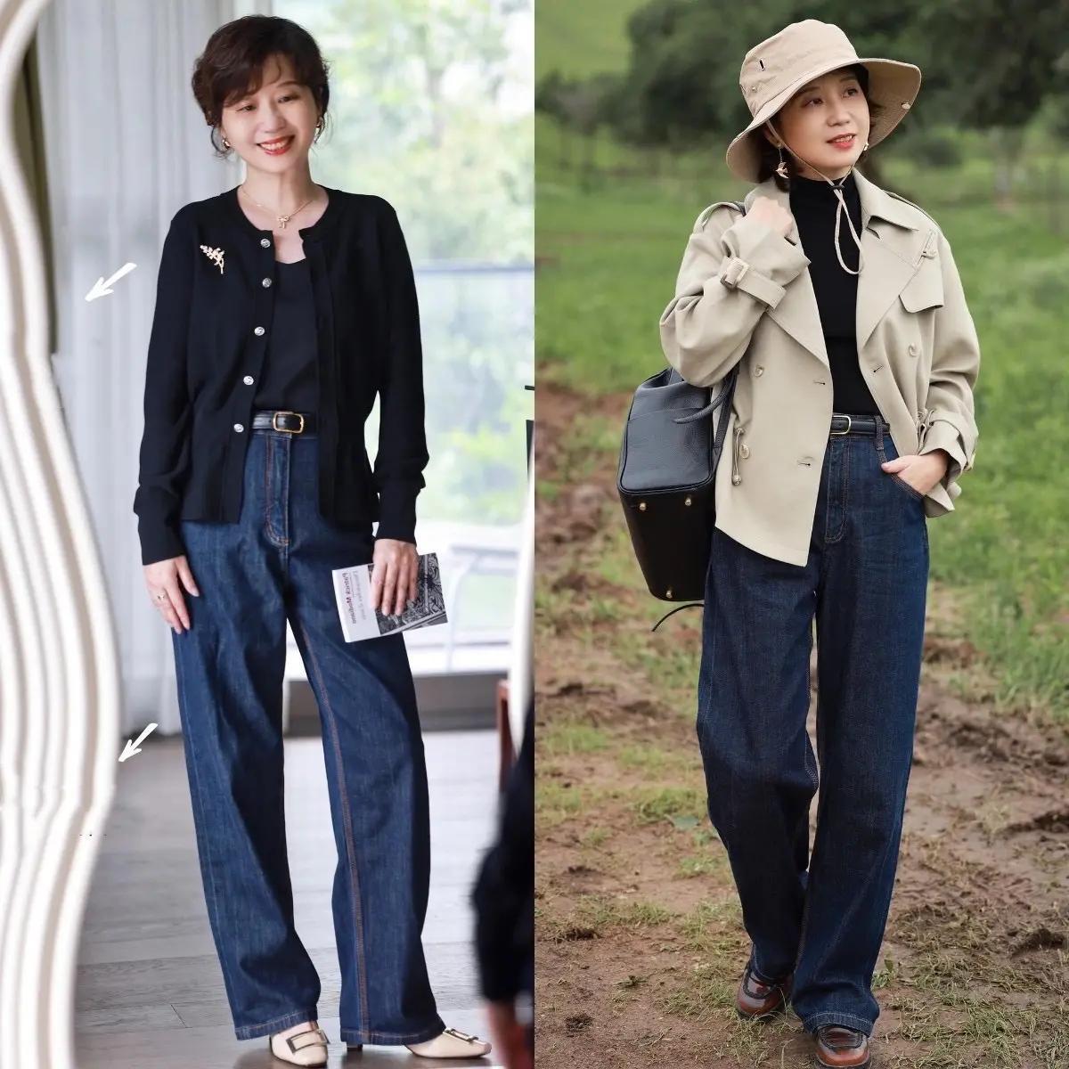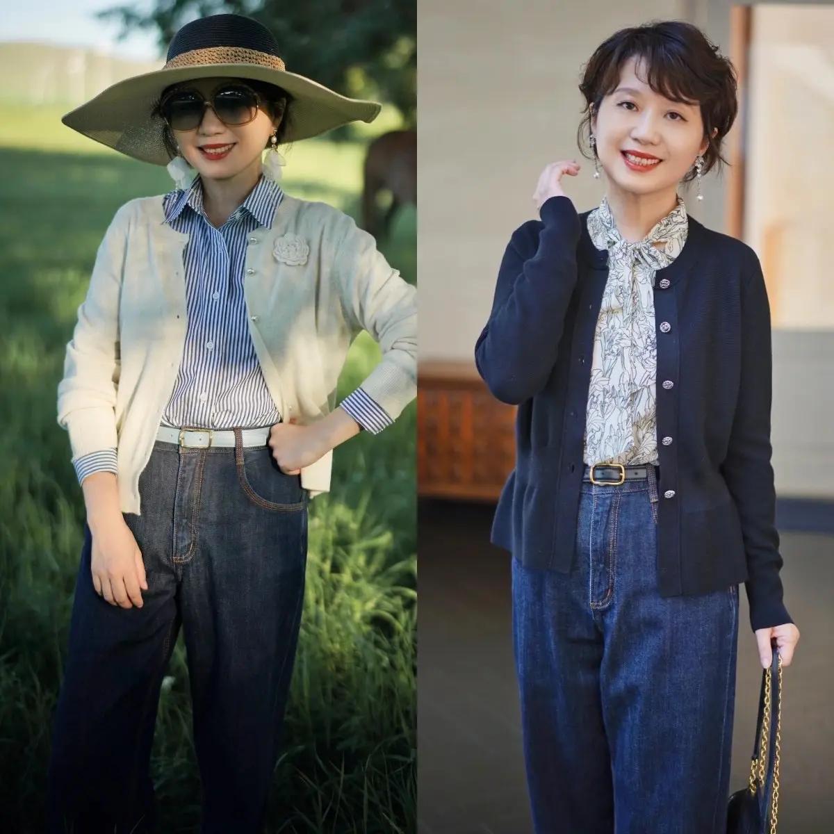 中年女性,这时辰咱们选择相比有品性的忠实开衫,举例底下用一件藏蓝色的忠实开衫,内搭印花的小众衬衫,上衣和一条经典的蓝色牛仔直筒长裤组合搭配,就能搪塞穿出优雅风,何况多礼大方,确凿很得当奔四奔五的中年女性。