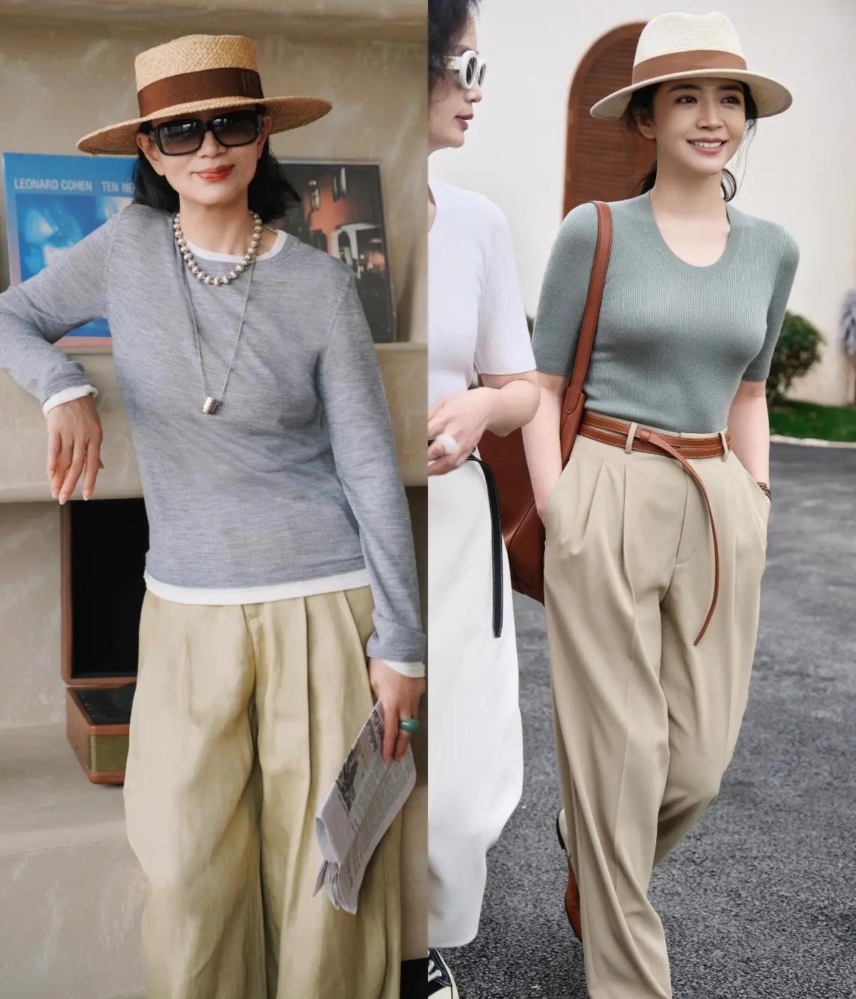 你很会搭配,果敢的去尝试不一样的穿衣立场,比如说底下这种相比有慵懒感的卡其色阔腿裤,搭配上透气性好,何况有点小修身的灰色忠实上衣,再加上紧密的妆容,还有一款相比有氛围感的凉帽,能让中年女性看起来更显年青。