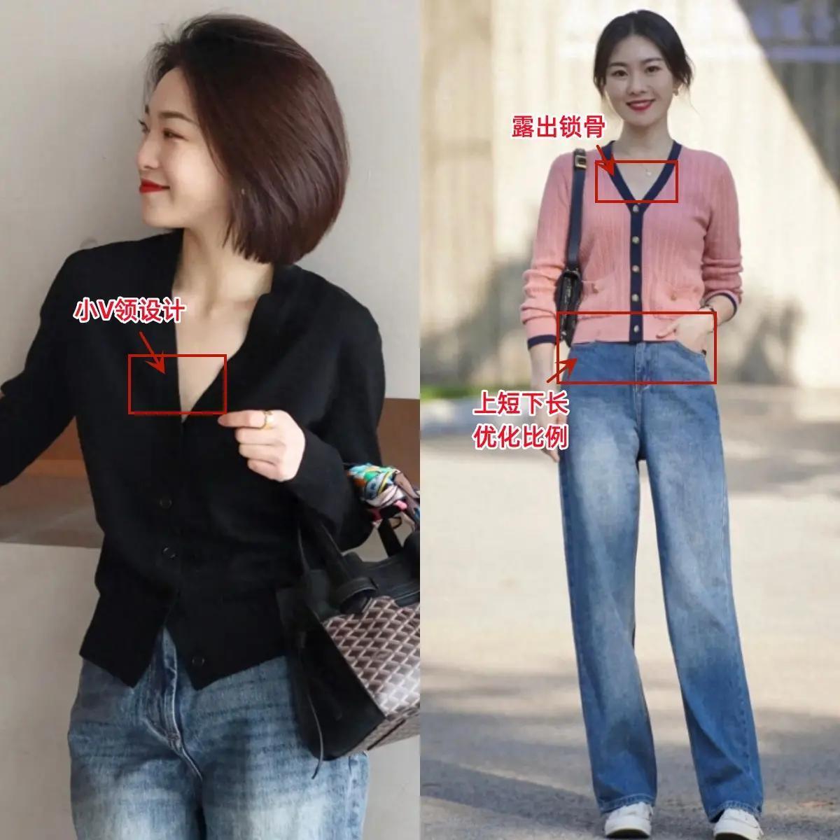 咱们也可以在穿戴的领子高低点功夫,比如说你思让我方的颈部线条更修长,或者是展现出你的锁骨,这时辰咱们可以选择小V领策画的忠实开衫,穿这么的穿戴,是不是就能让你变得愈加紧密考究?