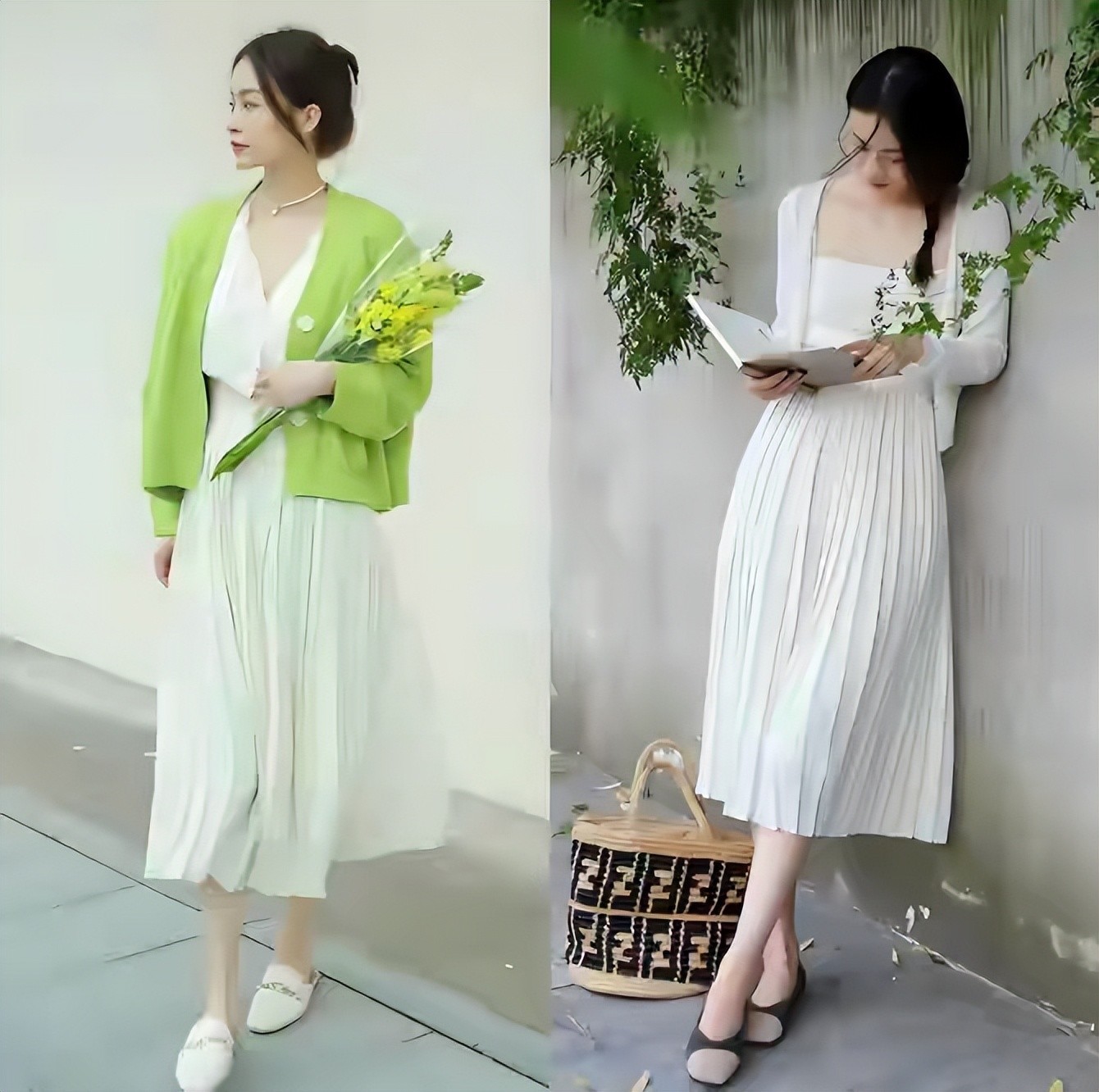 虽然了,你也可以选择绿色的忠实开衫来搭配上百褶半身裙,或者是奏凯选择白色的忠实开衫来搭配上一条吊带的拼接款,百褶半身裙,脚上选择低跟单鞋,穆勒鞋,轻搪塞松穿出女脸色质范。