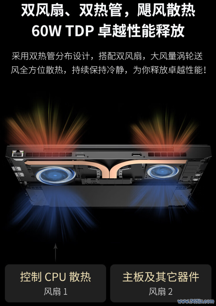 该款札记本采取 LPDDR5x 7500MT/s 内存(可选 16GB / 32GB / 64GB),接纳双电扇、双热管进行散热提供 60W TDP 性能开释(8840U 的出厂 TDP 功耗抑制在 28W~35W,可自行修改上限)。