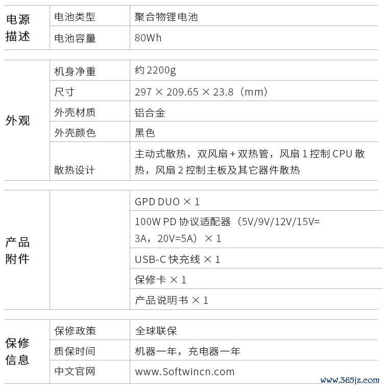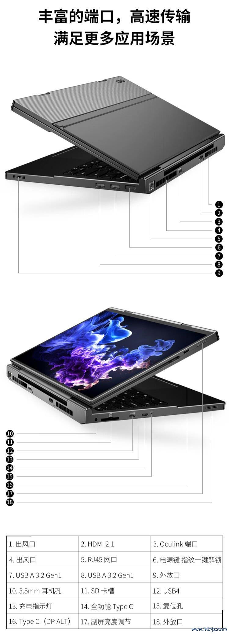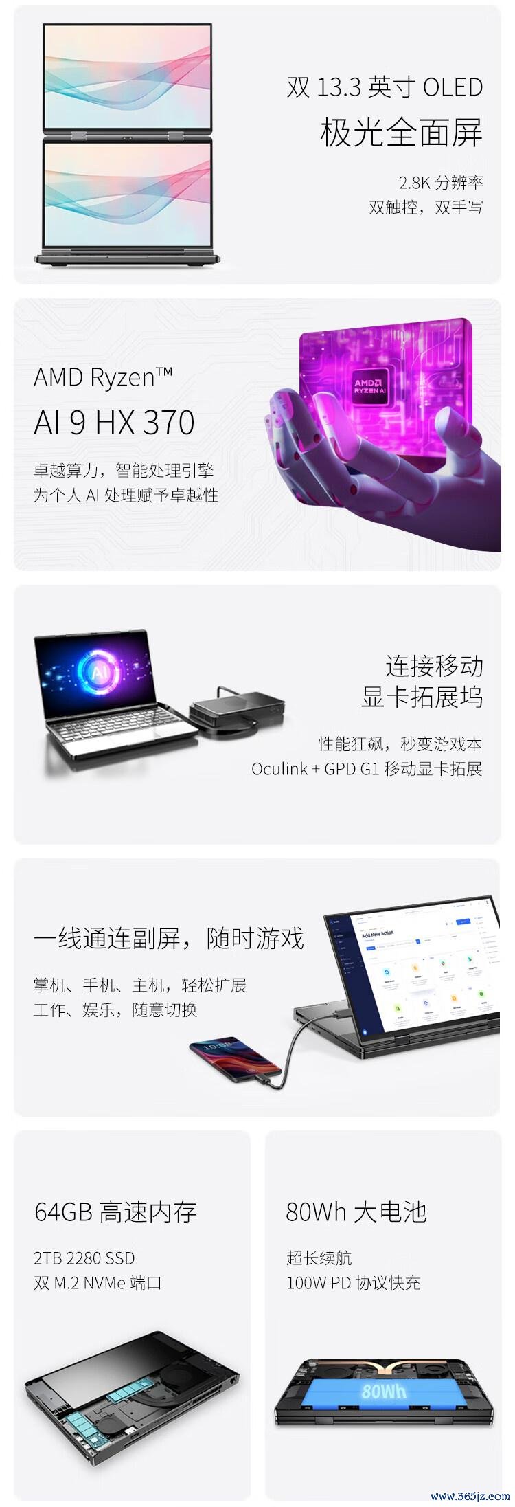 拓展性方面,GPD DUO 提供Oculink 显卡拓展坞接口、USB4 与 2.5GbE 有线网口在内的繁密接口,还搭载辞别率 2592 x 1944 的高清录像头与 80Wh 电板。细目如下: