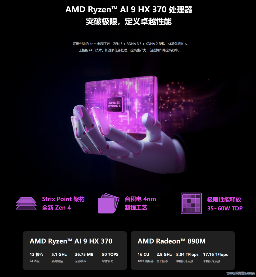 IT之家注:AMD Ryzen AI 9 HX 370基于全新 Zen5 架构,4nm 工艺制程,12 核 24 线程,睿频 5.1GHz、总体算力 80 TOPS。
