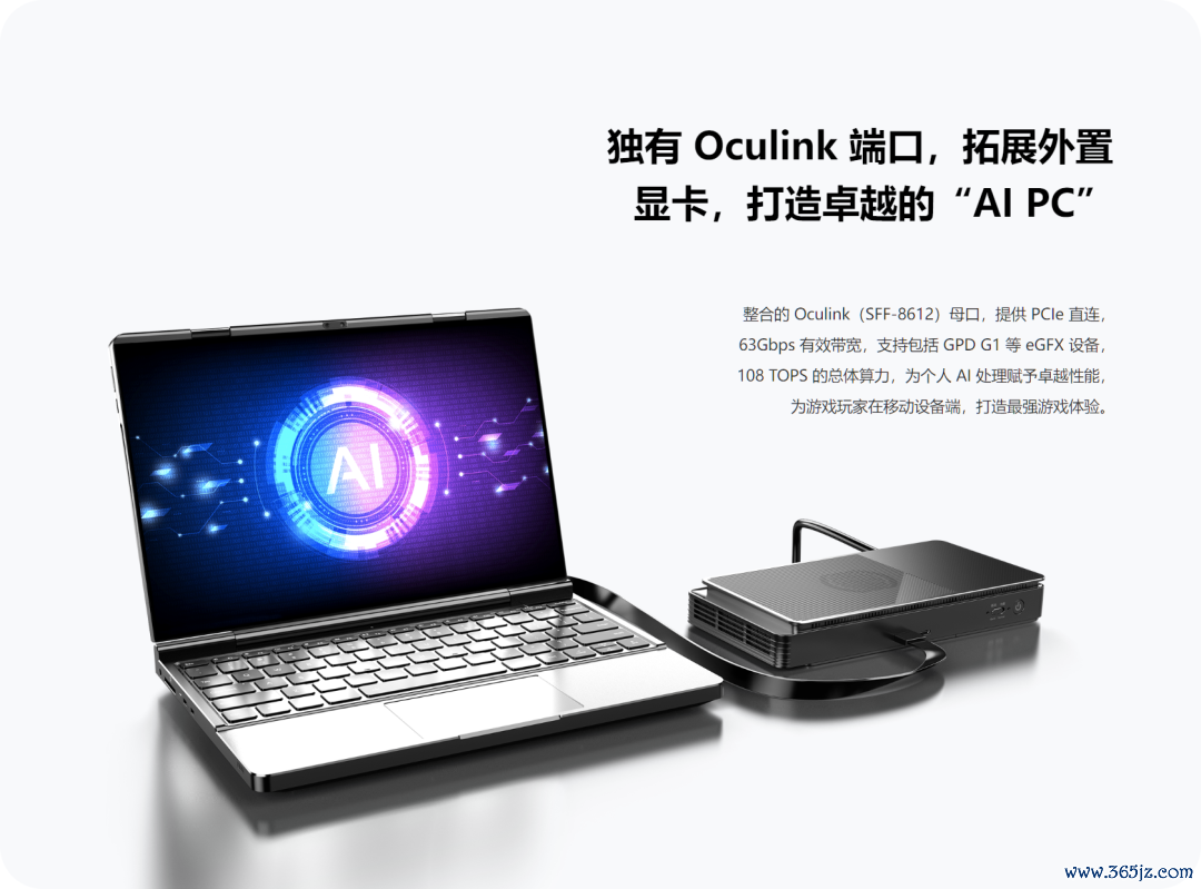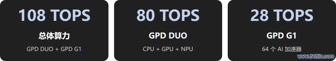 GPD DUO 整合的 Oculink(SFF-8612)母口,提供 PCIe 直连,63Gbps 灵验带宽,复旧包括 GPD G1 等 eGFX 诞生,108 TOPS 的总体算力。
